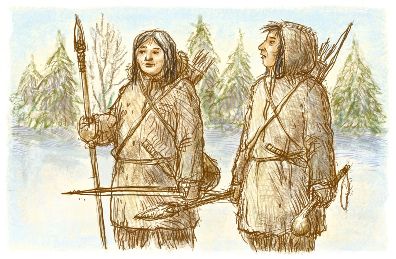 L'habillement des hommes l'hiver avec leurs outils et leurs armes de chasse