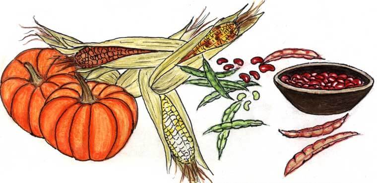 Les Iroquoiens se nourrissent principalement des produits de l’agriculture : le maïs, les courges et les haricots. En les cultivant ensemble dans les mêmes champs, ces trois plantes s’entraident : par exemple, les haricots se servent des tiges du maïs pour grimper et les feuilles du maïs protègent les courges du vent et du soleil. Ces trois produits sont appelés les trois sœurs.