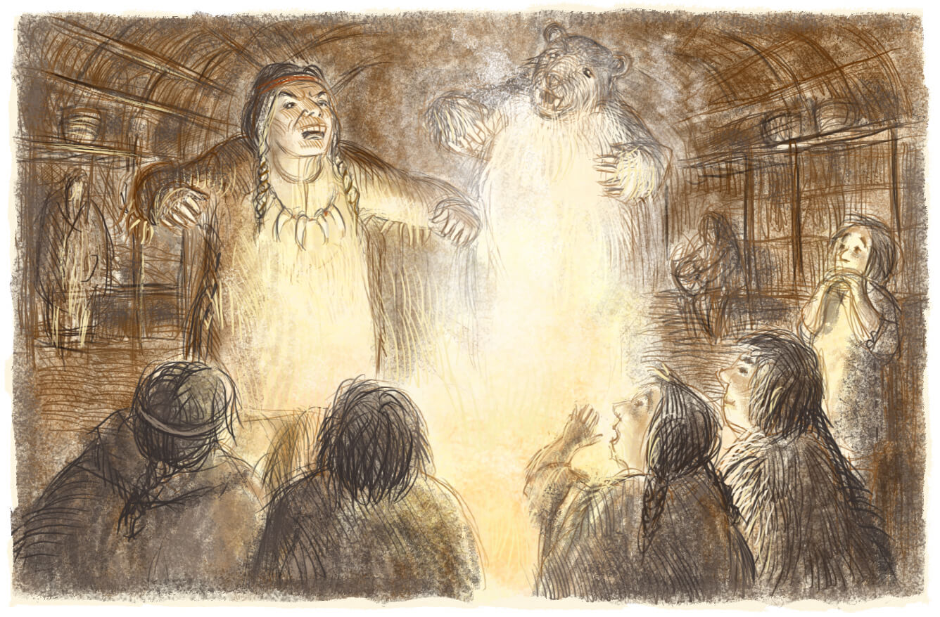 En 1500, les Autochtones n’ont pas de système d’écriture. Les choses du passé et les savoirs se transmettent par la parole, c’est ce qu’on appelle la tradition orale. Les jeunes enfants comprennent très tôt l’importance d’écouter les récits des personnes plus âgés. De cette façon, ce qui est raconté d’une génération à l’autre n’est pas oublié.