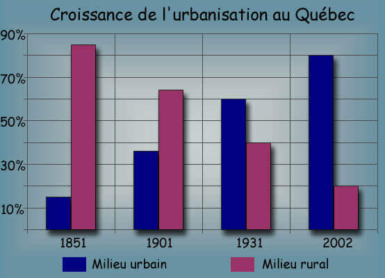 L’industrialisation du Québec amène un autre phénomène : l’urbanisation. En effet, de plus en plus de gens habitent dans les villes plutôt qu’à la campagne. La plupart des gens qui s’installent en ville le font parce que c’est là que se trouvent les industries. Il est donc plus facile de se trouver du travail.
