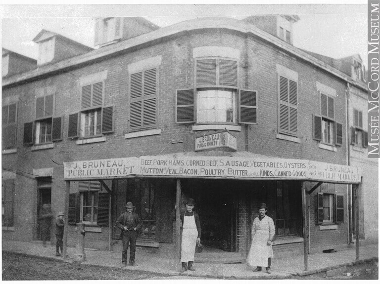 Boucherie de J. Bruneau, à l'angle des rues Jures et Hermine, Montréal, QC, vers 1905
