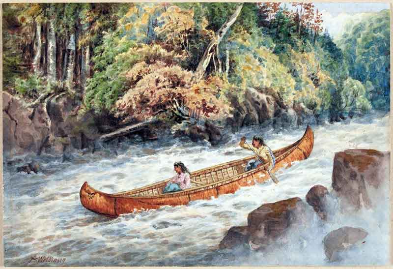 Autochtones descendant les rapides en canot d'écorce