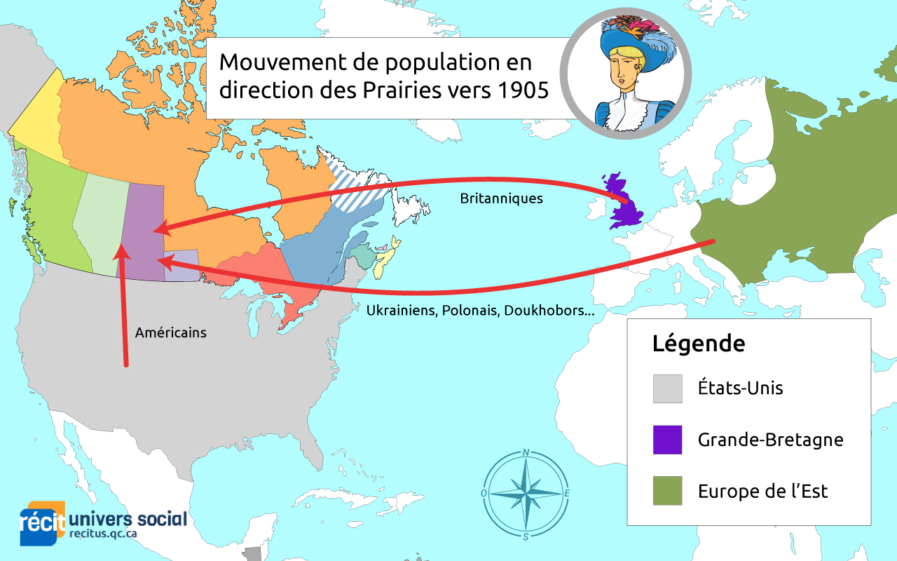Les Canadiens les plus nombreux à s'établir dans les Prairies sont les Ontariens. Dans une plus petite proportion, des Québécois, en partie des francophones, quittent aussi pour les Prairies. Sur les 808 863 habitants en 1906, un peu plus de la moitié est née au Canada, soit 444 366 personnes.