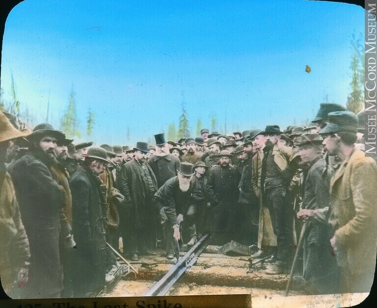 Donald A. Smith enfonçant le dernier crampon pour compléter le chemin de fer du C.P. en 1885