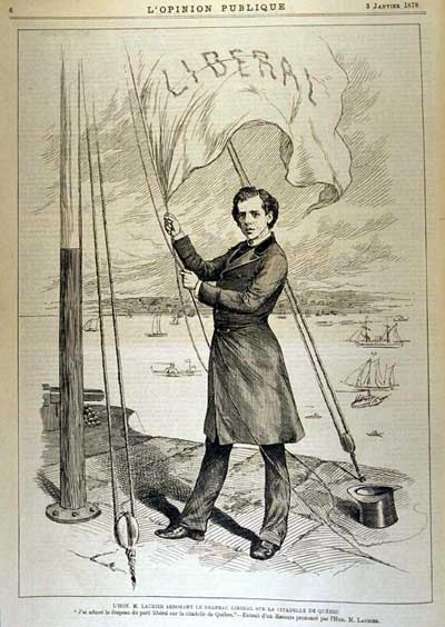 Wilfrid Laurier arborant le drapeau Libéral sur la citadelle de Québec.