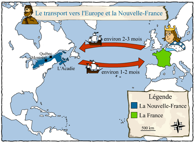Les autres colonies françaises en Amérique, comme l’Acadie, sont aussi très loin de la Nouvelle-France. Le voyage en bateau entre Québec et l’Acadie peut prendre jusqu’à 15 jours.