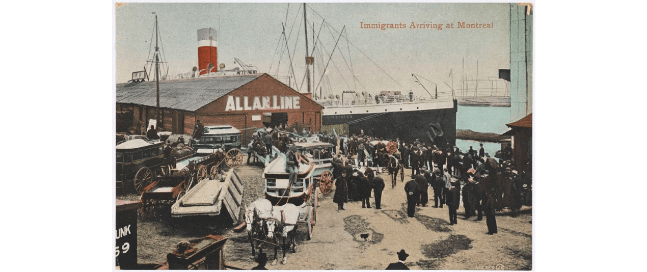 Carte postale. Immigrants arrivant au port de Montréal, à la fin du 19e siècle