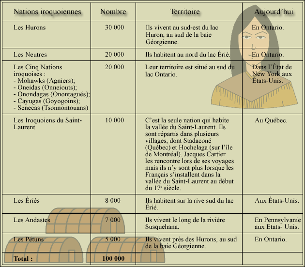 Le nom, la population et l'emplacement des différentes nations iroquoiennes vers 1500