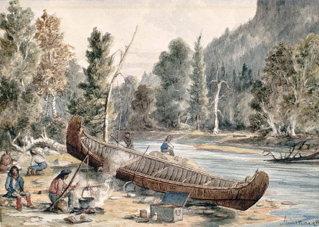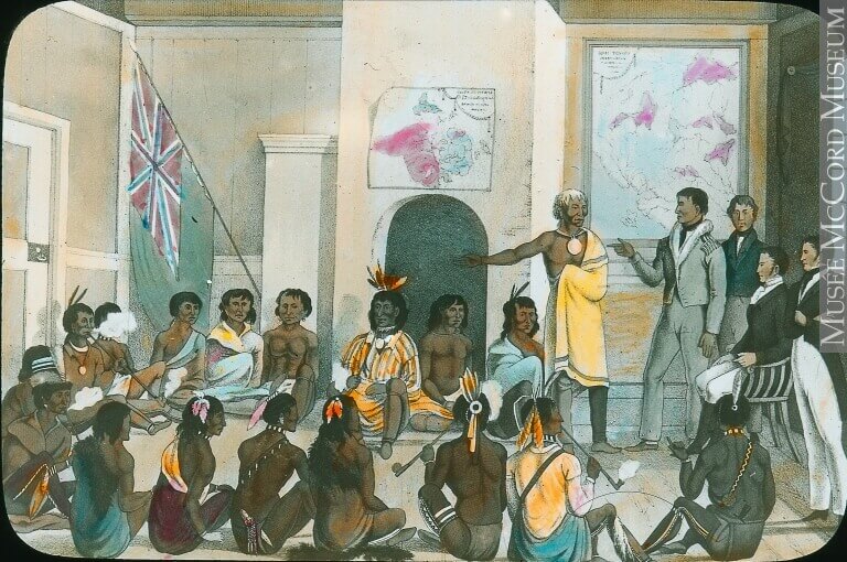 Depuis l’arrivée des Européens, la traite des fourrures était l’activité économique la plus importante chez les Premières Nations. Les Autochtones qui voulaient obtenir des biens européens comme les haches de fer et les fusils de chasse devaient se tourner vers la traite et faire des affaires avec les marchands européens. Mais en 1820, la traite des fourrures est en déclin. Les fourrures se vendent moins bien et la chasse intensive a beaucoup fait baisser le nombre d’animaux. Il devient de plus en plus difficile pour les Autochtones de gagner leur vie grâce à cette activité. Certains sont même privés de ressources essentielles à leur alimentation et à la confection de vêtements.