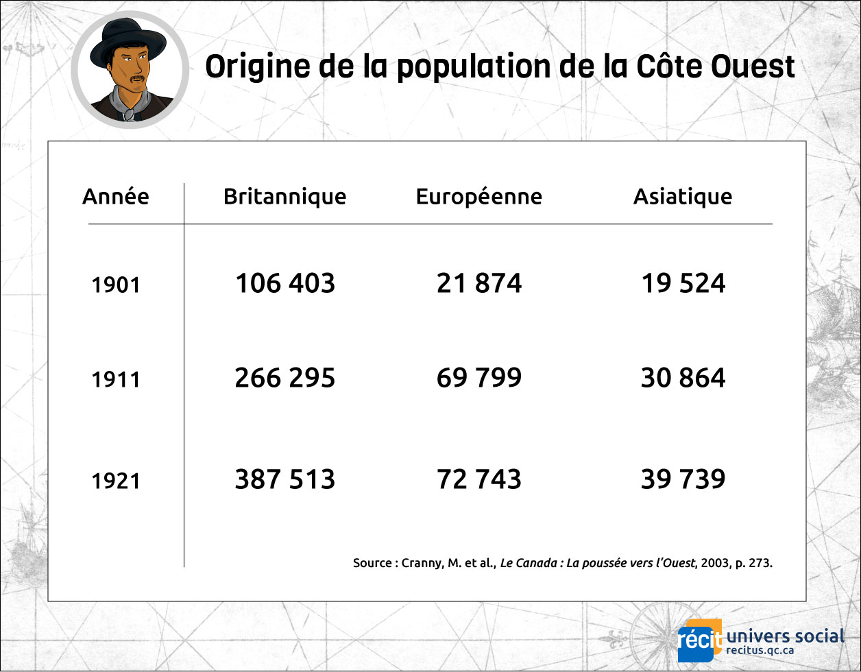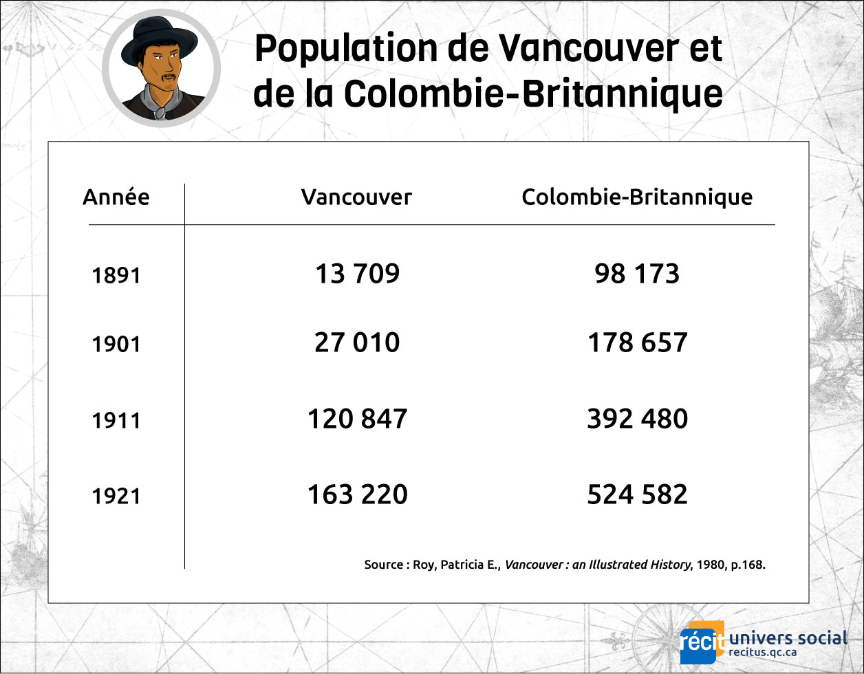 Bonjour monsieur, vous êtes un nouvel arrivant, n'est-ce pas? Vous savez, vous n'êtes pas le premier immigrant à arriver cette année. En 1905, nous sommes 180 000 habitants en Colombie-Britannique et ce nombre ne cesse d'augmenter. Nous nous trouvons en ce moment à Vancouver qui est la plus grande ville de la province. Elle compte près de 30 000 habitants et sa population a doublé depuis dix ans. La principale raison? L'immigration ! Venez, je vais vous faire visiter Vancouver.