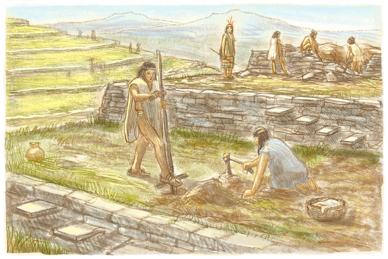 Des Incas sont en train de construire les terrasses afin de pouvoir cultiver la terre