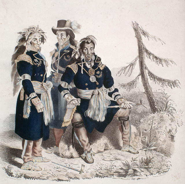 Trois chefs hurons de Jeune-Lorette dans des costumes fortement influencés par les Français