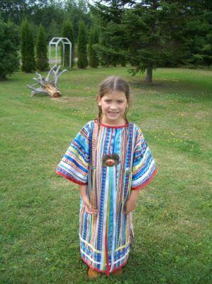 Une jeune micmac affiche fièrement une robe traditionnelle qu'elle a confectionnée avec sa grand-mère