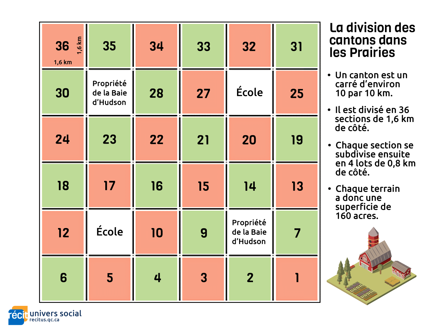 Comment fait-on pour vivre sur un si grand territoire? Il faut d’abord savoir qu’on ne peut pas s’installer n’importe où dans les Prairies. Le territoire a été découpé comme une grille : d’abord en grands carrés, appelés cantons – ces cantons sont différents de ceux du Québec, plus rectangulaires –, puis chaque canton a été divisé en 36 sections et chaque section à nouveau coupée en quatre parties de 160 acres. La terre qu’un colon reçoit équivaut à la plus petite partie, on l’appelle un homestead.