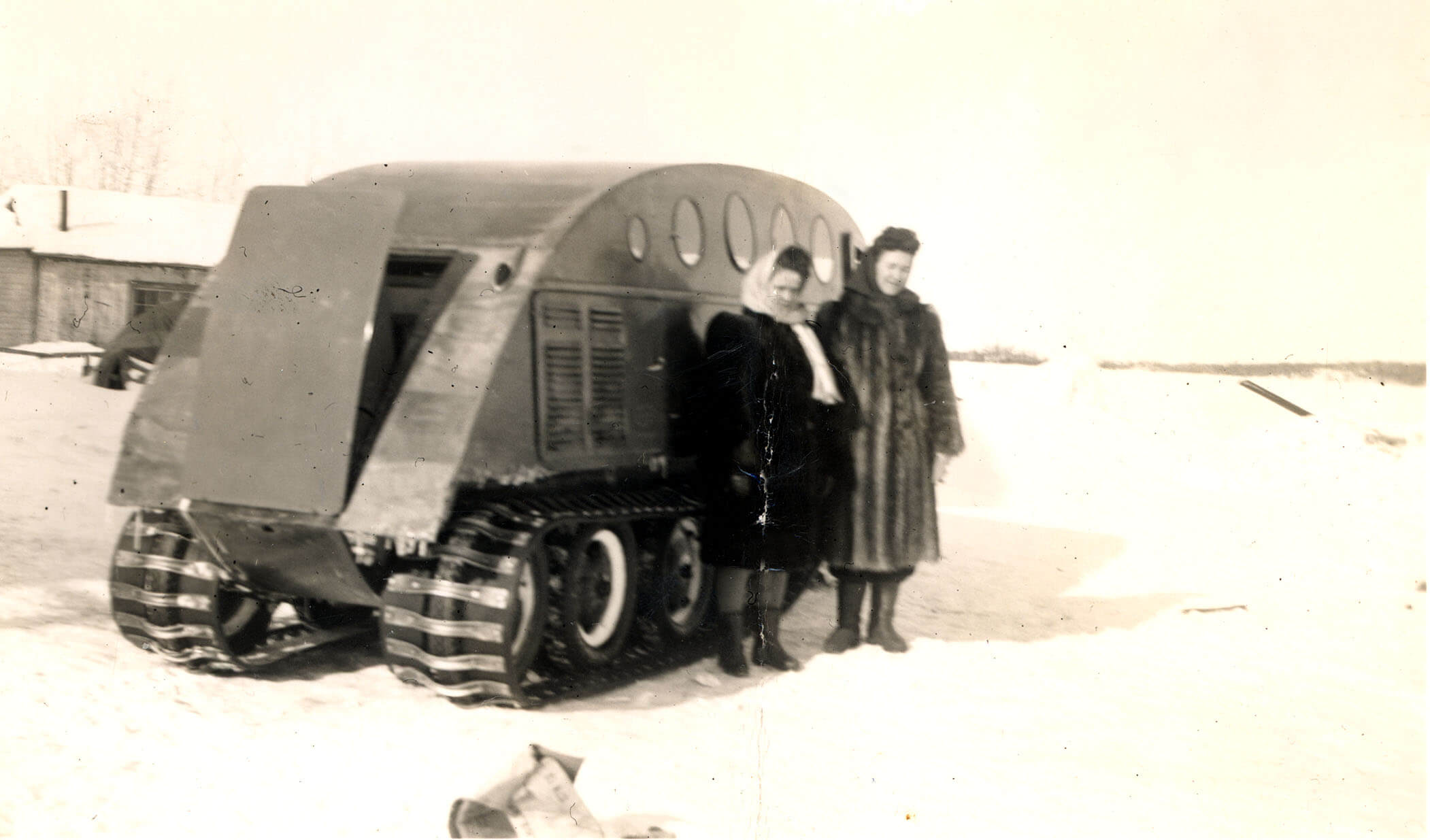 Deux femmes devant la moto-neige Bombardier B-12, construite en 1951