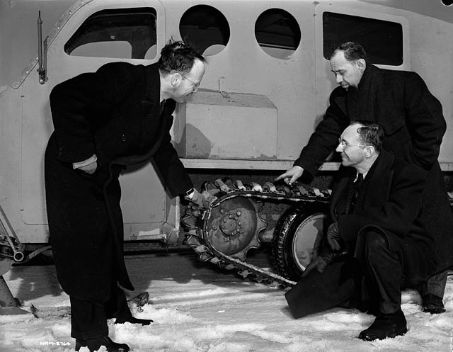 Joseph-Armand Bombardier (à gauche), créateur de l'entreprise Moto-neige Bombardier Limitée, 1943